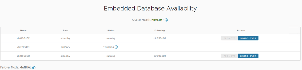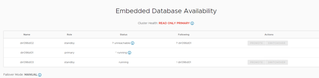 As explained in this VMware document the database cluster health can be determined by logging in as root to the appliance management UI at https://primary_eth1_ip_address:5480. The database state this time was READ ONLY PRIMARY.