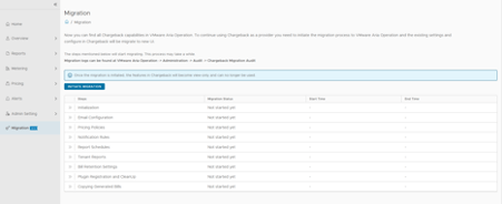 Tip 1: Once upgraded to Chargeback 8.16 there is a new Migration Tab. Initiate Migration tab will remain greyed out if there are any VCDs connected to Aria Ops with a version less than 10.5.1