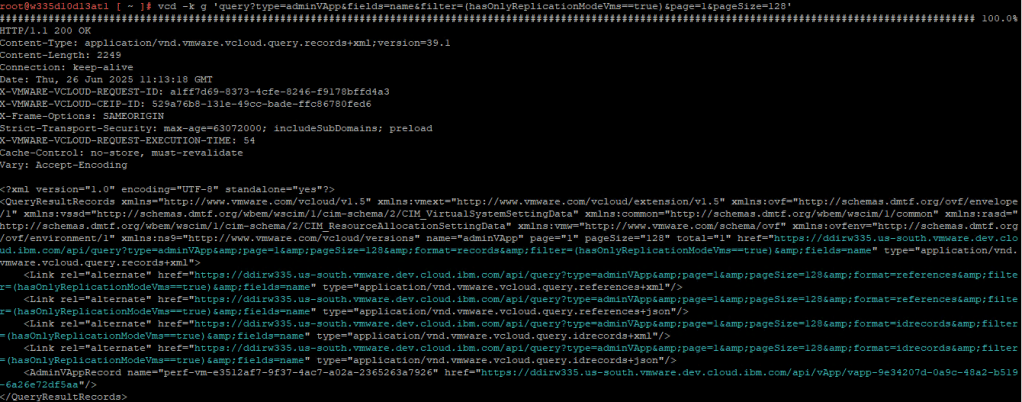vcd -k g 'query?type=adminVApp&fields=name&filter=(hasOnlyReplicationModeVms==true)&page=1&pageSize=128'