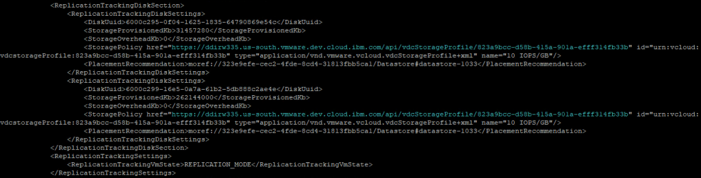 The most interesting part from a VCDA perspective is the ReplicationTrackingDiskSettings section as it tells you what datastore(s) are being used for disk placement.