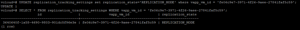 UPDATE replication_tracking_settings set replication_state='REPLICATION_MODE' where vapp_vm_id = 'vm-uuid';